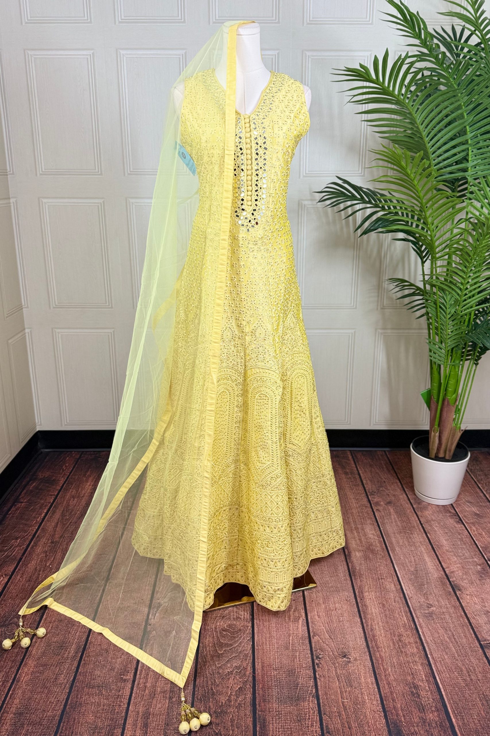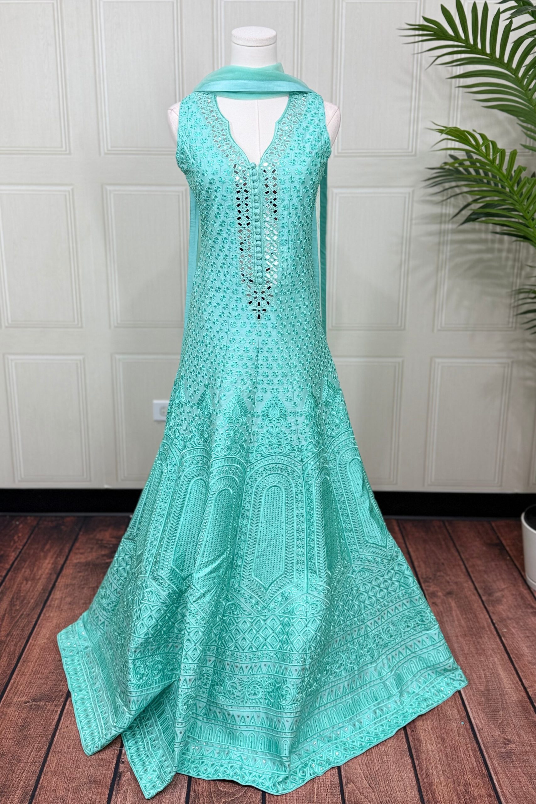 This sea green silk gown set brings a fresh and radiant charm to any celebration. Crafted in smooth silk, the gown features delicate mirror work that adds a touch of sparkle with every movement. Paired with comfortable leggings and a soft net dupatta, the ensemble offers both elegance and ease of wear.