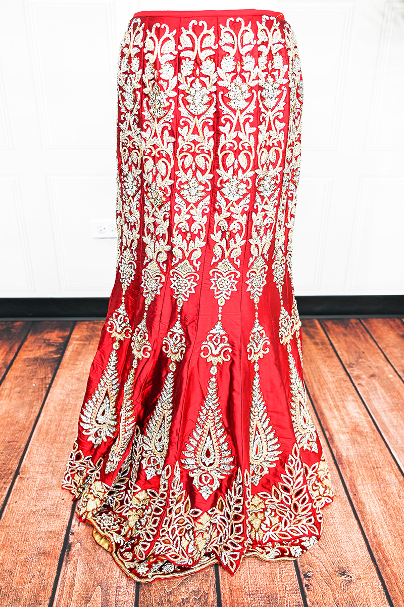 The heavy red soft net dupatta drapes gracefully, completing the ensemble with an ethereal touch. This 3-piece set is perfect for weddings, receptions, or any grand celebration where you want to make a lasting impression.