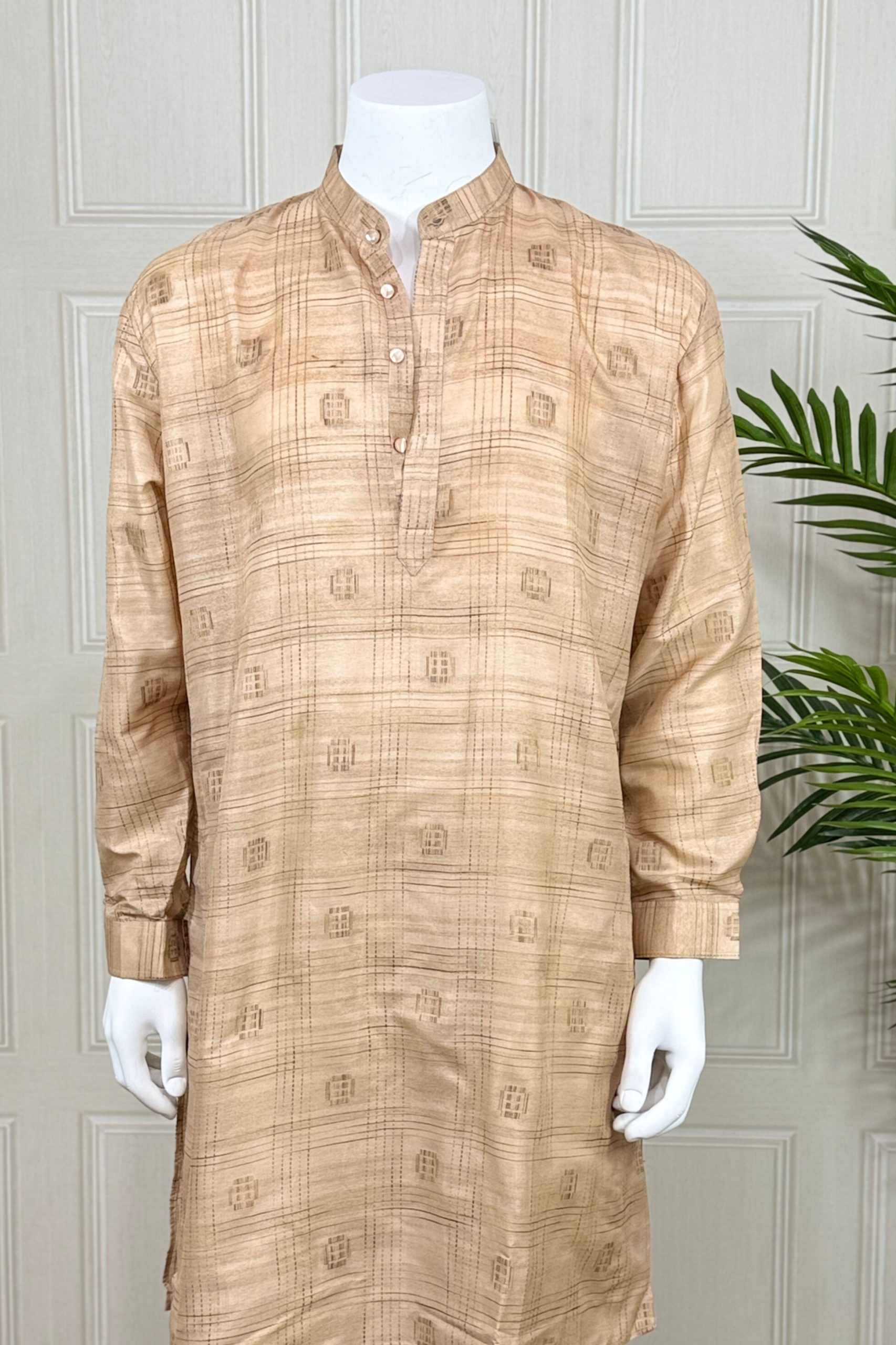 Elevate your ethnic wardrobe with this stylish men’s kurta set in a sophisticated rose gold hue. Crafted from a comfortable cotton blend, this set ensures a soft, breathable feel for all-day wear. The kurta features self-work embroidery, adding subtle texture and elegance, while the matching bottom completes the coordinated look.