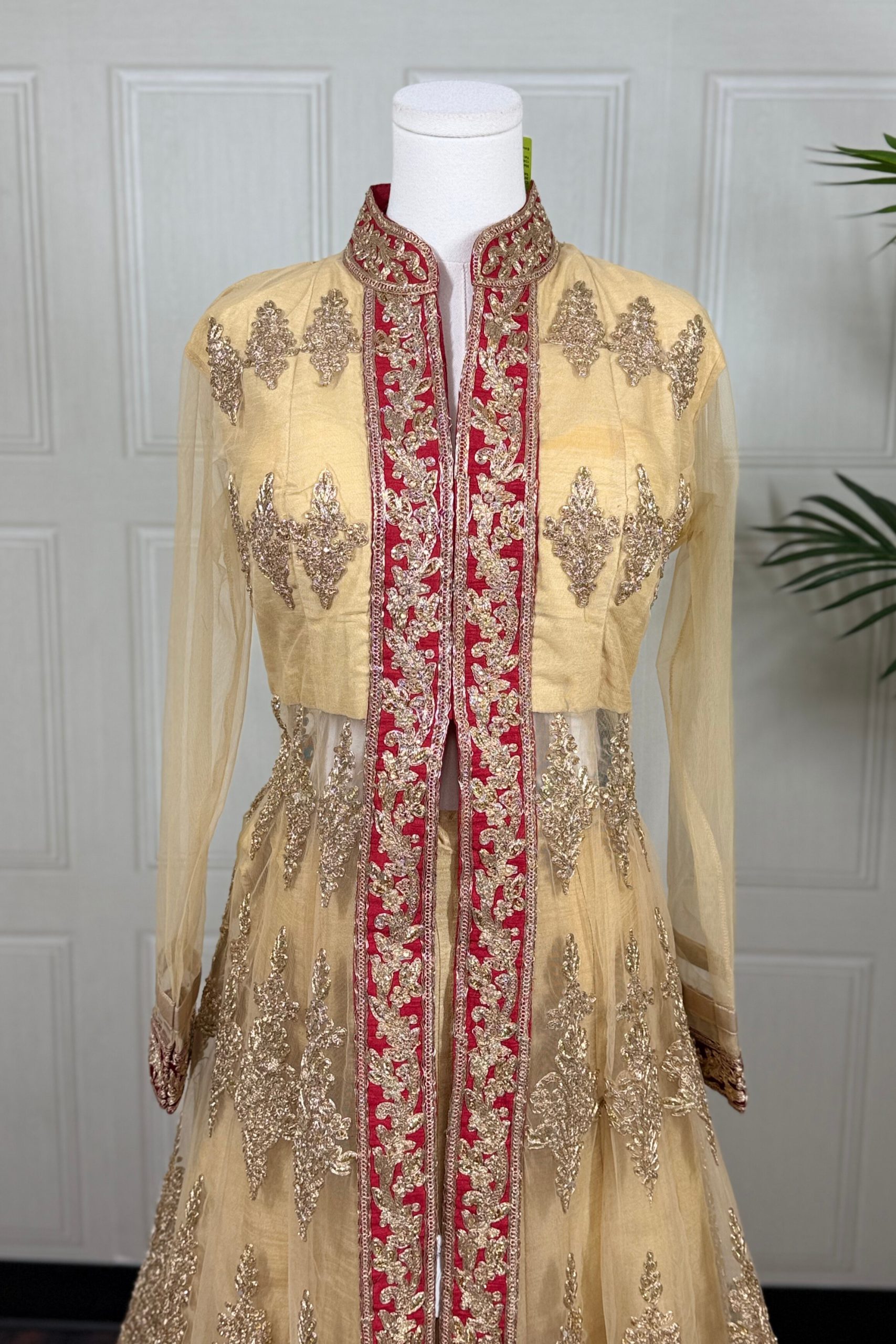This gold lacha set brings together rich textures and intricate craftsmanship for a regal festive look. The raw silk skirt shines with a natural lustre, enhanced by a striking red border that adds traditional depth and vibrance. The soft net top and dupatta feature delicate zari embroidery embellished with stones and sequins, creating a refined shimmer and an opulent finish.