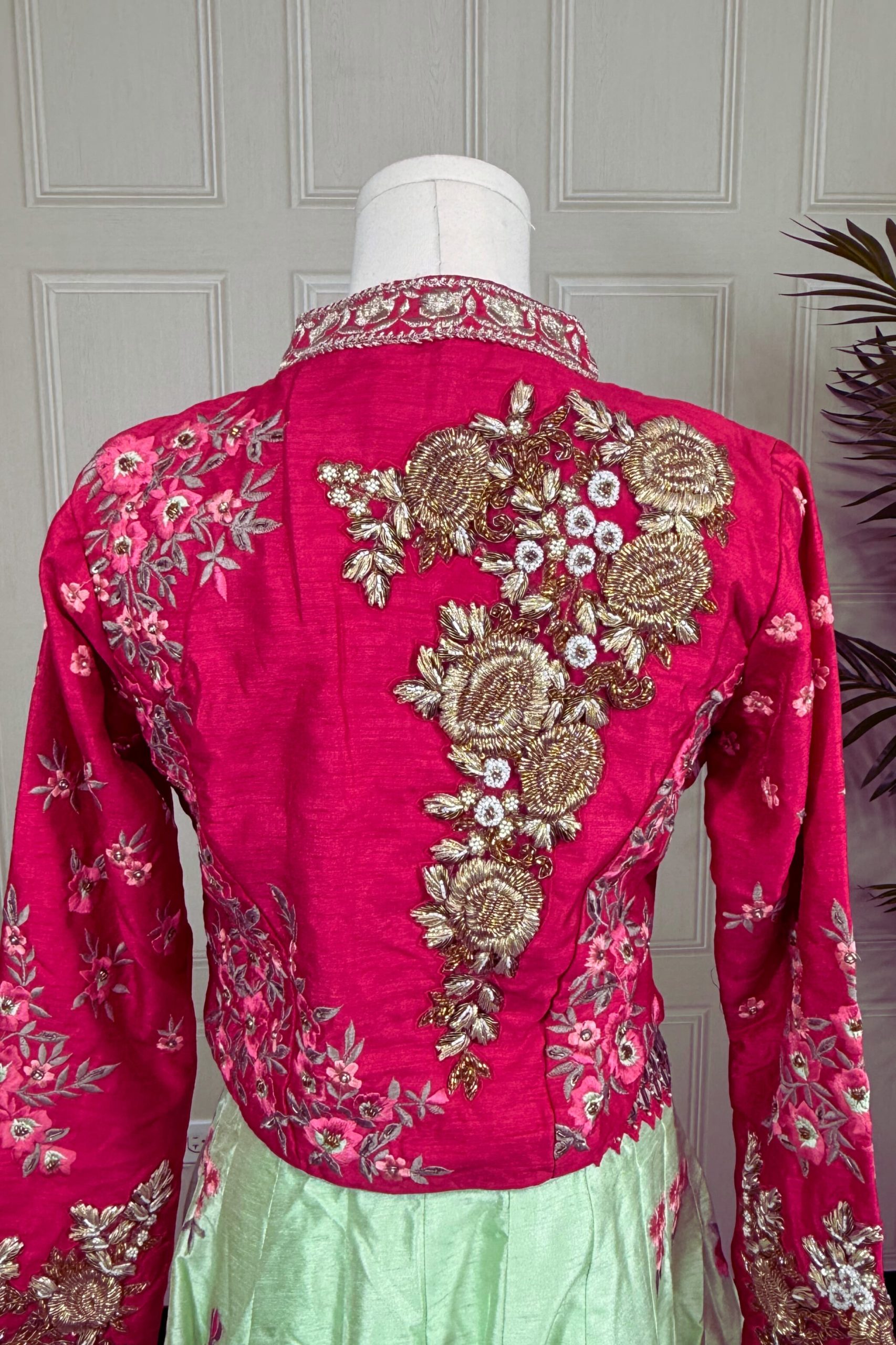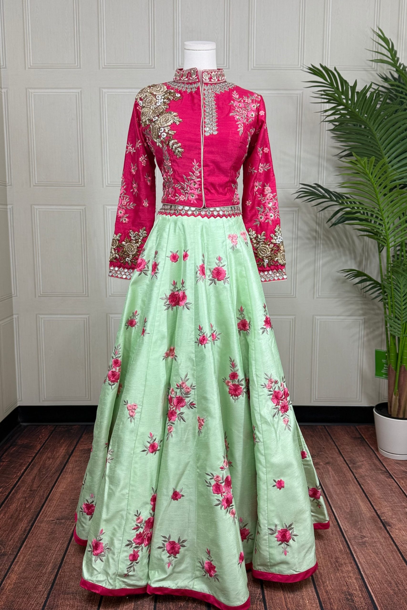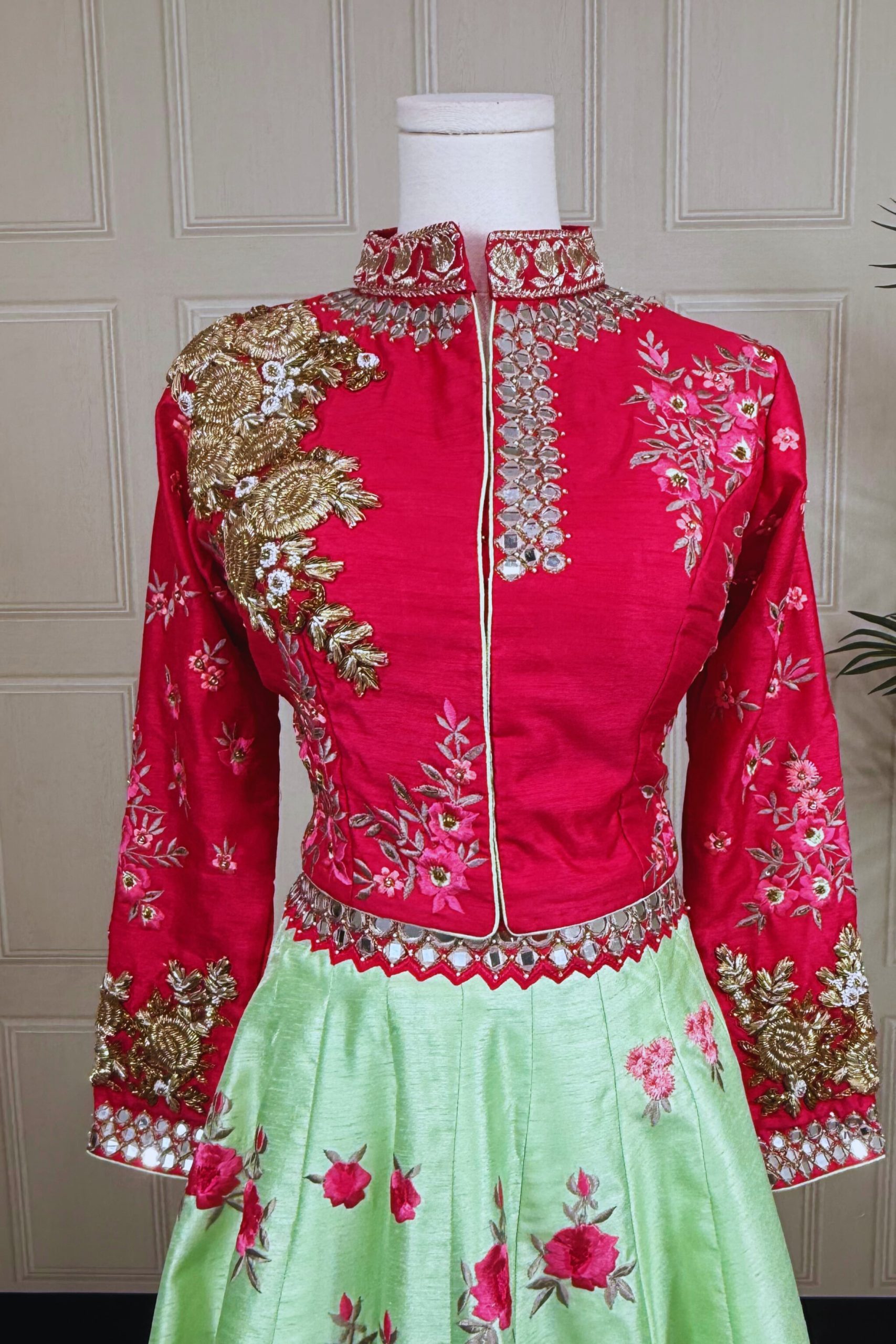 This elegant lehenga set features a mint green raw silk skirt adorned with delicate pink floral designs. The raw silk choli showcases intricate zari and mirror work with a stylish front-open closure, adding a touch of tradition with modern appeal. Paired with a soft net mint green dupatta, this ensemble is perfect for festive and wedding occasions.