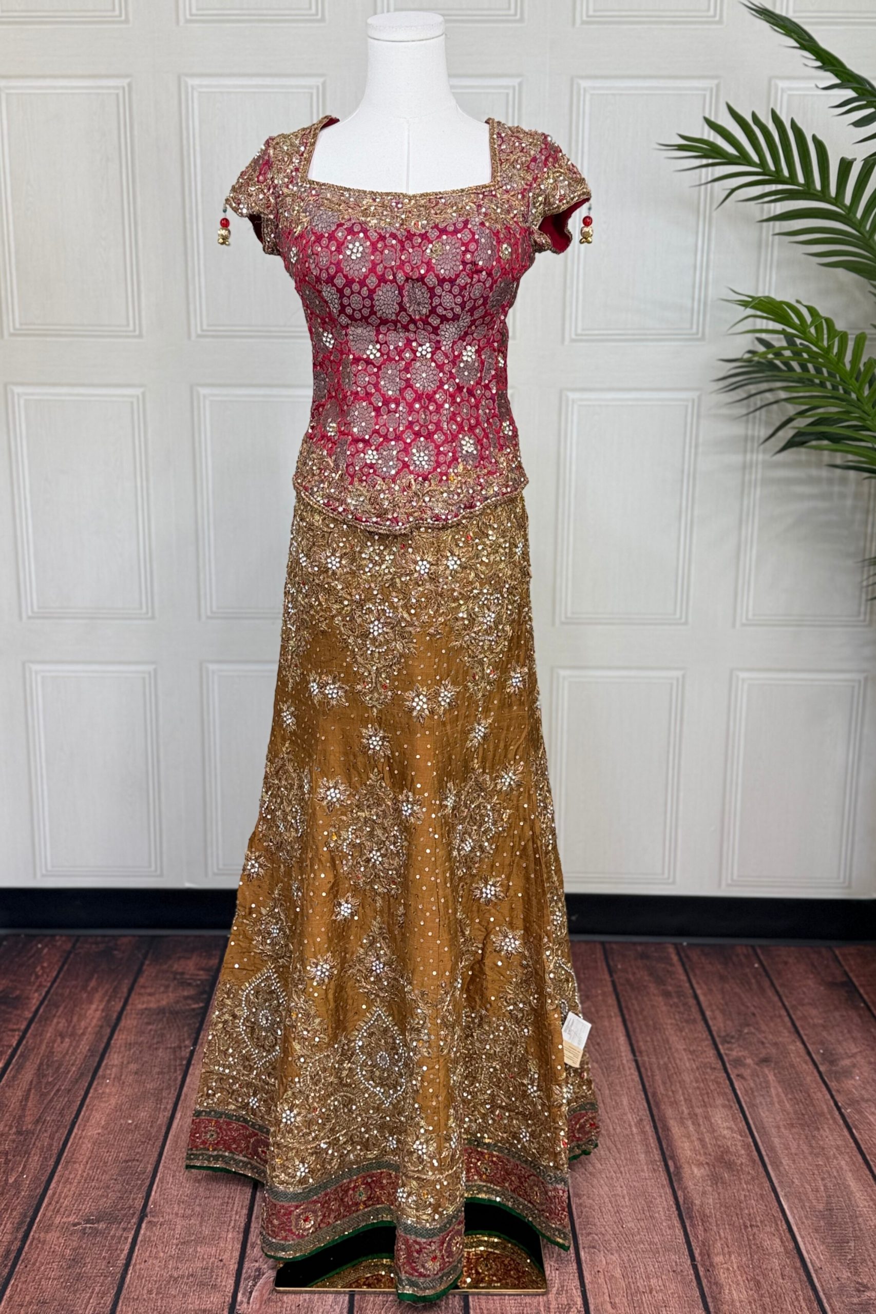 This bridal lehenga set blends timeless heritage with rich artisanal detailing for a truly regal look. The mustard raw silk skirt creates a grand and structured silhouette, beautifully paired with a brick red Banarasi blouse that adds traditional charm and woven luxury. Intricate zardozi and stone work enhances the ensemble with a radiant bridal glow and heirloom-worthy craftsmanship.