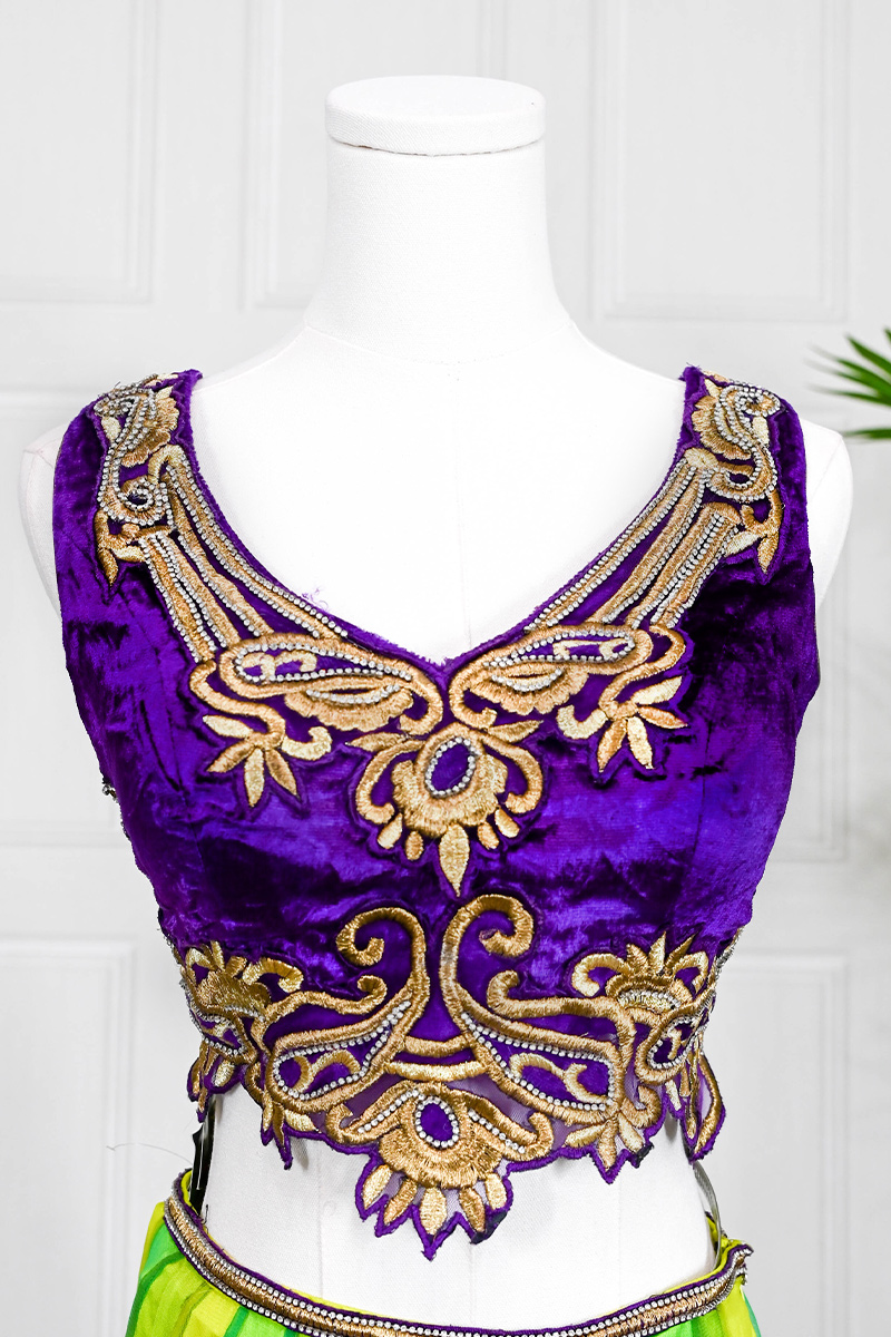 This vibrant 3-piece lehenga choli set features a striking neon green and lime yellow lehenga and dupatta, paired beautifully with a rich purple velvet blouse. Crafted with delicate thread embroidery and stone work, the soft net lehenga and dupatta add an elegant touch to this bold ensemble.