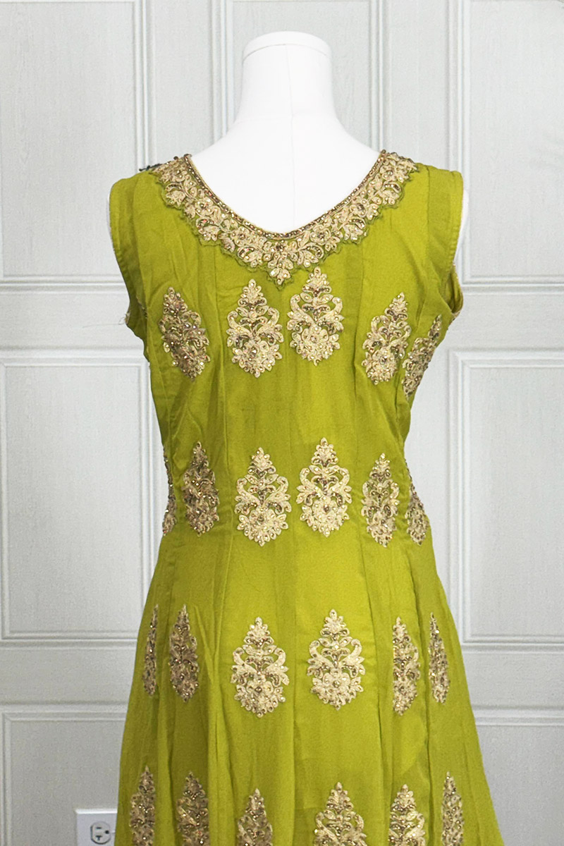 Grace meets elegance in this pear green 3-piece gown set. Crafted from flowy georgette fabric, the dress features delicate stone and zari work for a sophisticated shimmer.