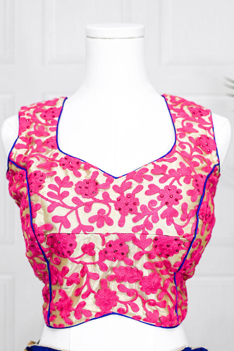 Grace meets grandeur in this beautifully crafted Pink, Gold, and Blue Lehenga Choli — a 3-piece ensemble that exudes festive charm.