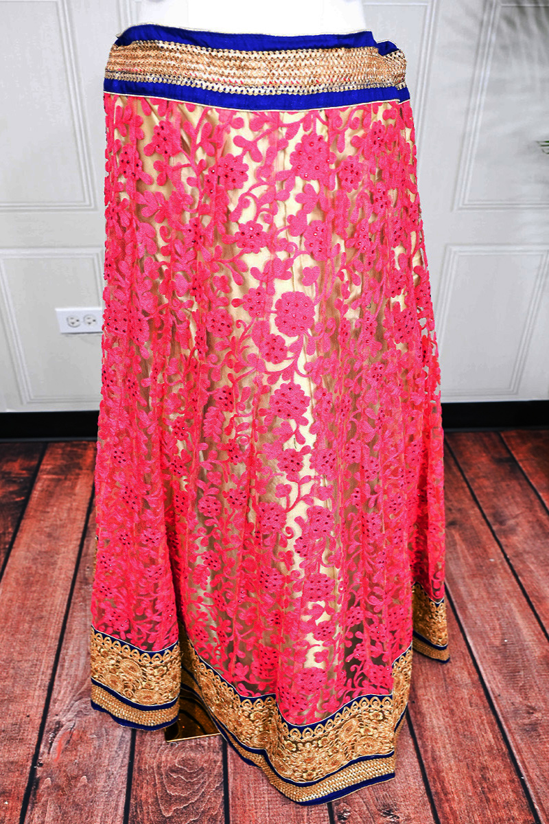Made with soft net fabric, the lehenga and blouse are adorned with intricate thread and zari work that catches the light and complements the vibrant color palette.