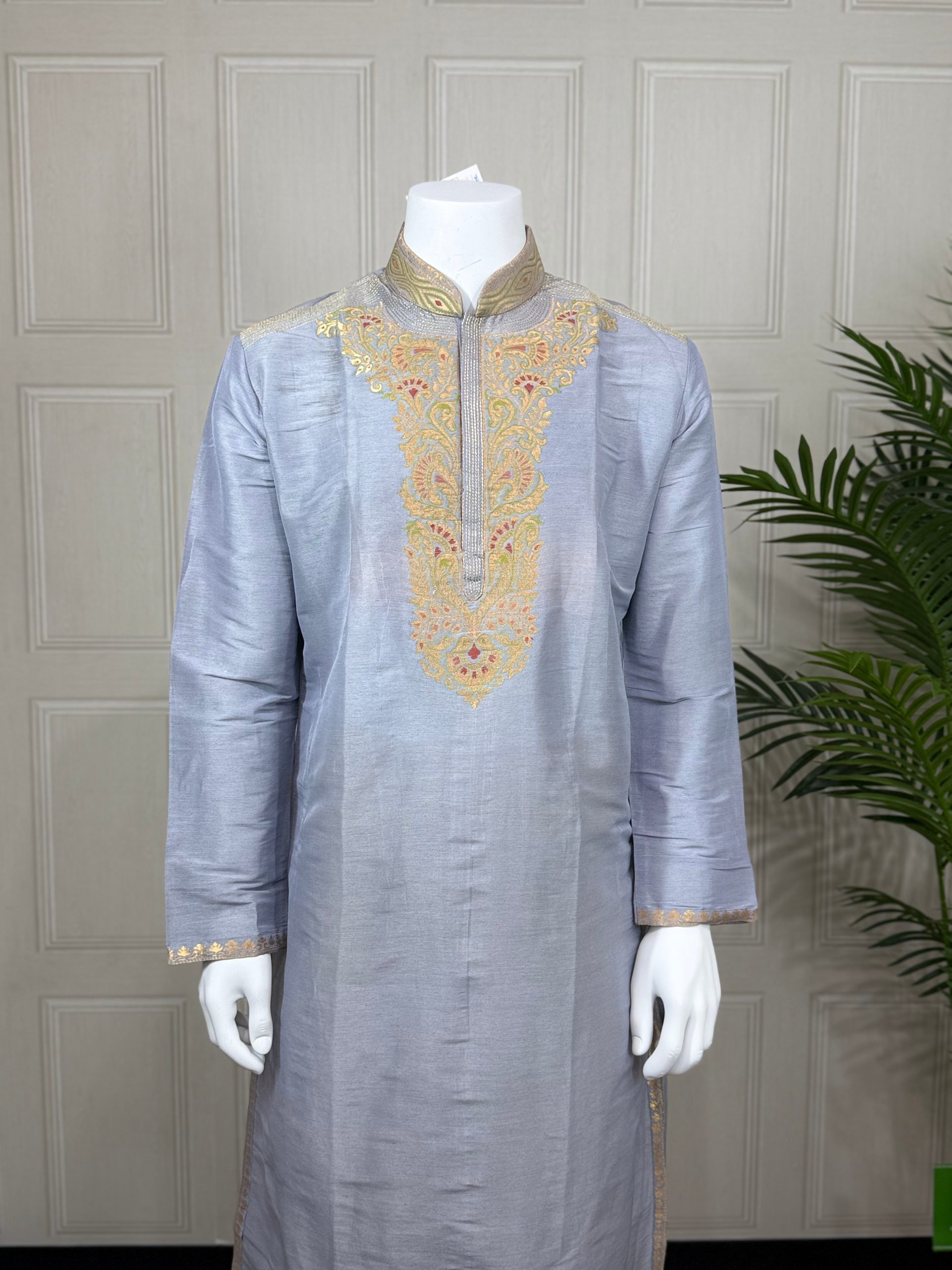 Elevate your festive style with this elegant powder blue men’s kurta set crafted in premium raw silk for a rich and regal look. The kurta features intricate multicolor self-design embroidery that adds subtle texture and sophistication without overpowering the outfit. It is paired with classic gold raw silk bottoms for a perfectly balanced traditional ensemble.