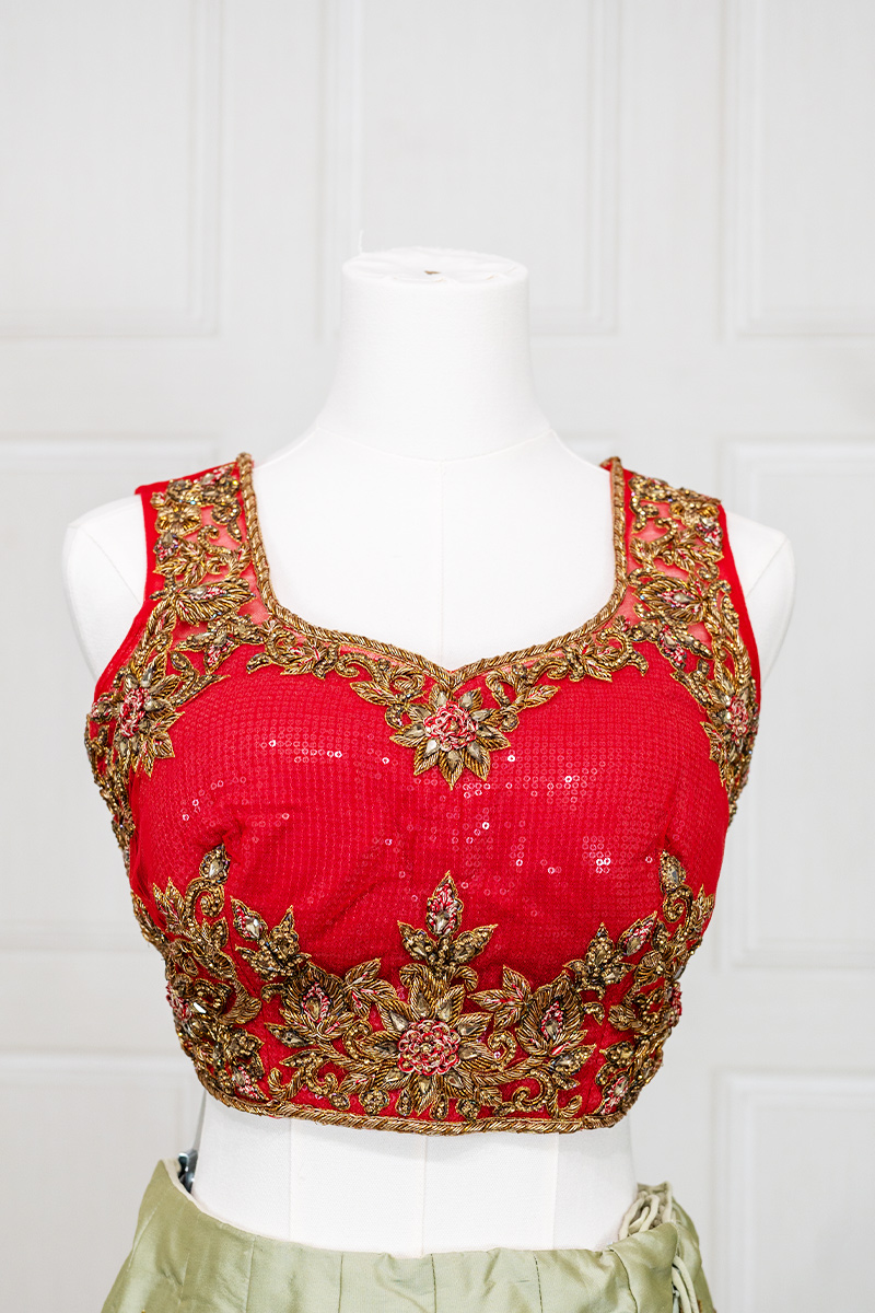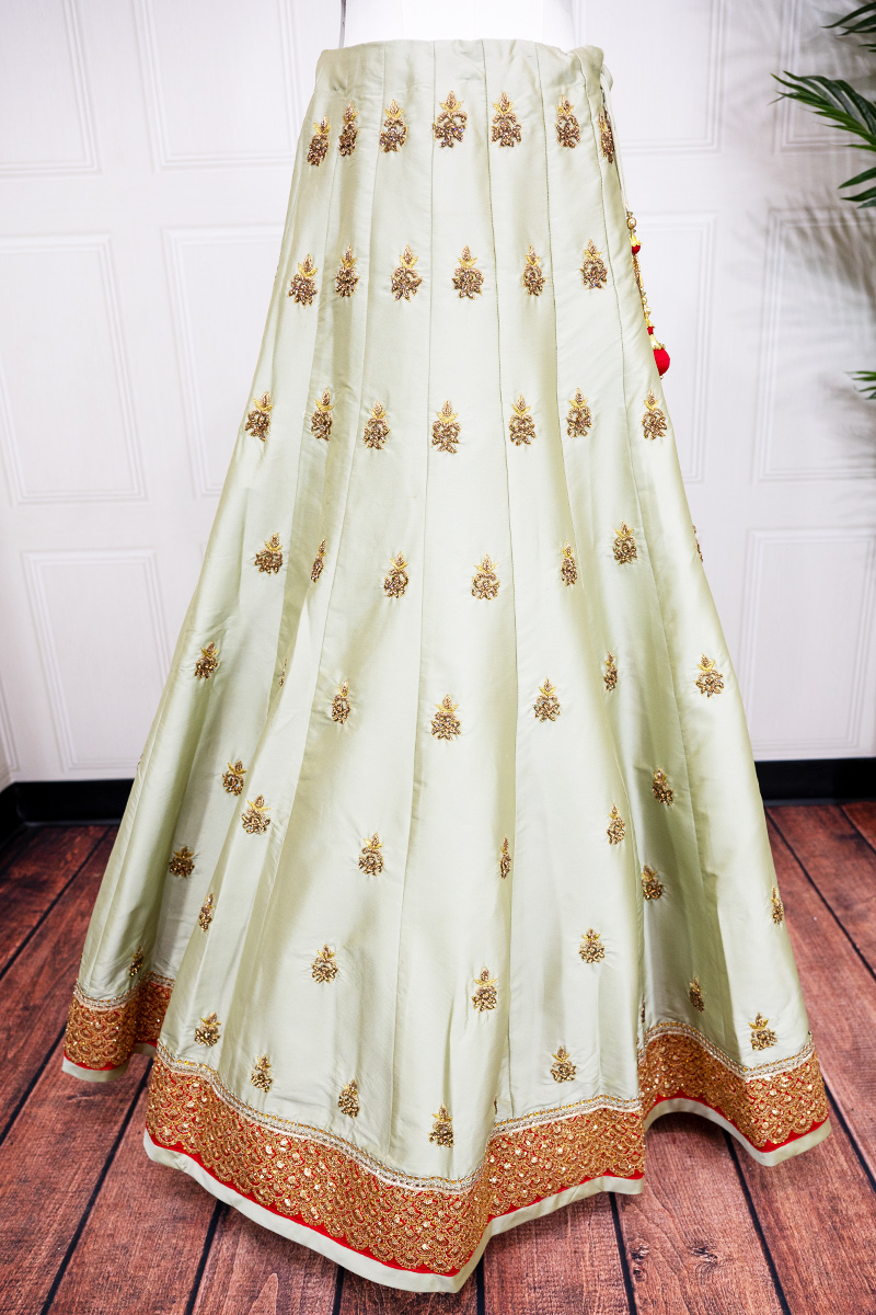This stunning Sahil Cloths Women’s Lehenga Choli in red and sage green is a perfect blend of traditional beauty and modern elegance. The 3-piece set features a raw silk lehenga, a soft net blouse, and a dupatta, all adorned with intricate zari and stone work for a luxurious finish.