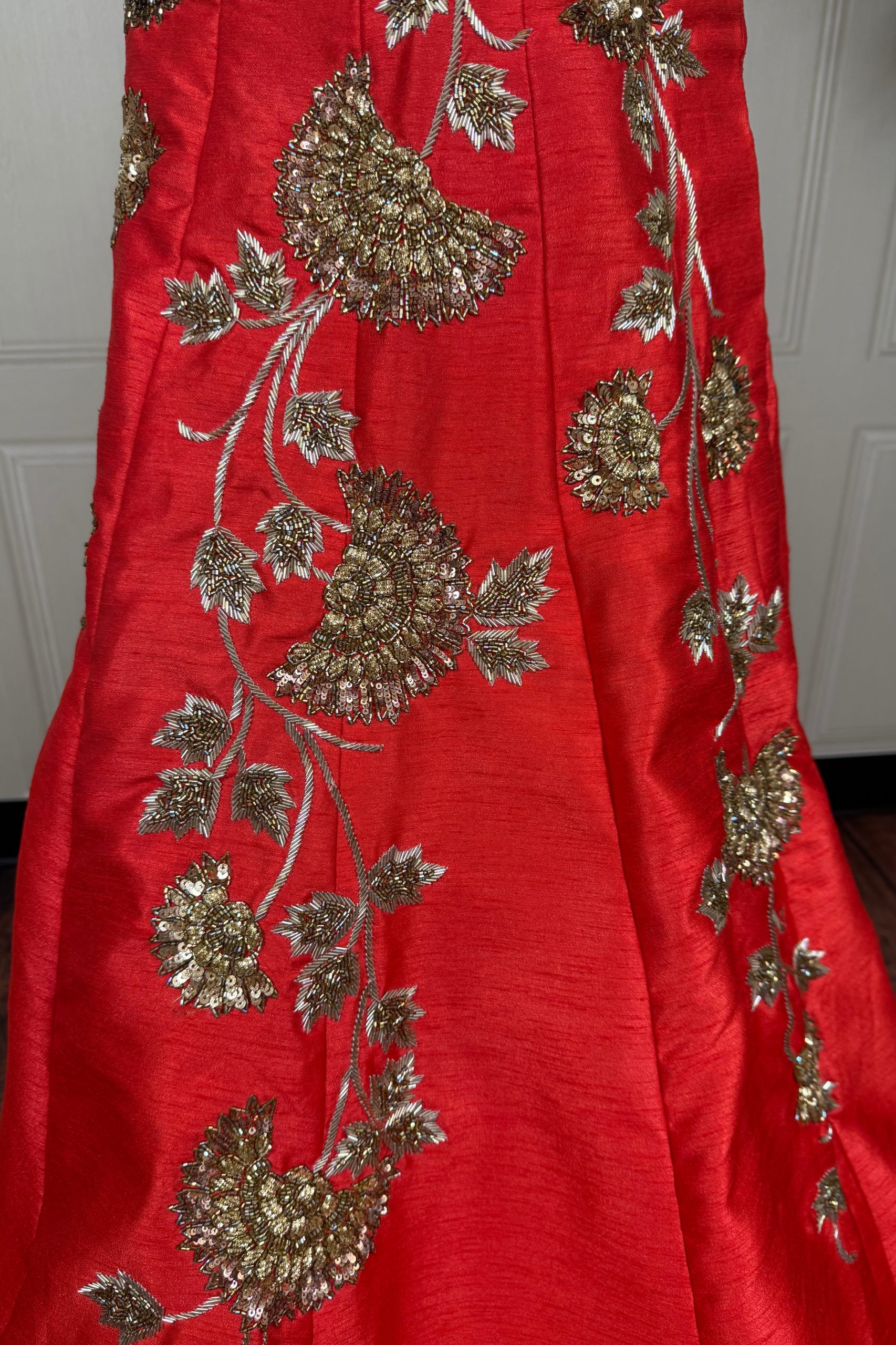 Elevate your festive and wedding looks with this exquisite red lehenga set, featuring a beautifully crafted blouse and flowing skirt adorned with intricate sequin and zari embroidery. The blouse showcases delicate patterns that shimmer gracefully, while the skirt adds a touch of elegance with its fluid drape and rich embellishments. Completing the ensemble is a soft net dupatta, light and airy, perfectly complementing the detailed work of the lehenga. This set is a perfect blend of traditional artistry and contemporary style, designed to make you shine at every celebration.