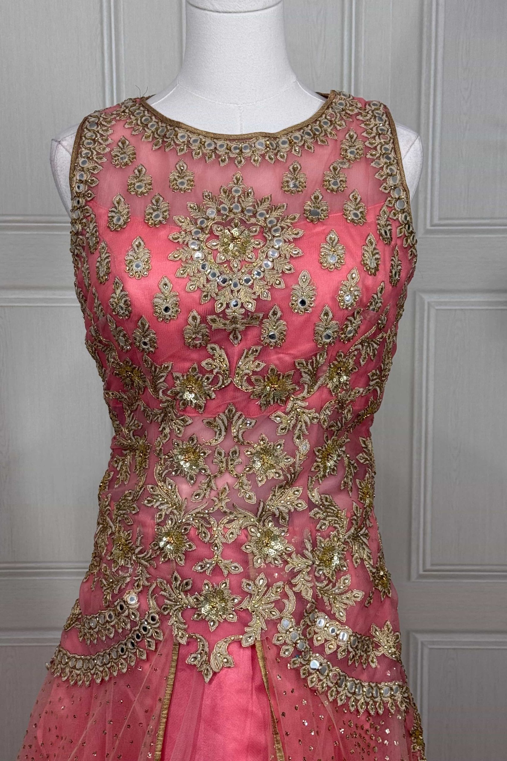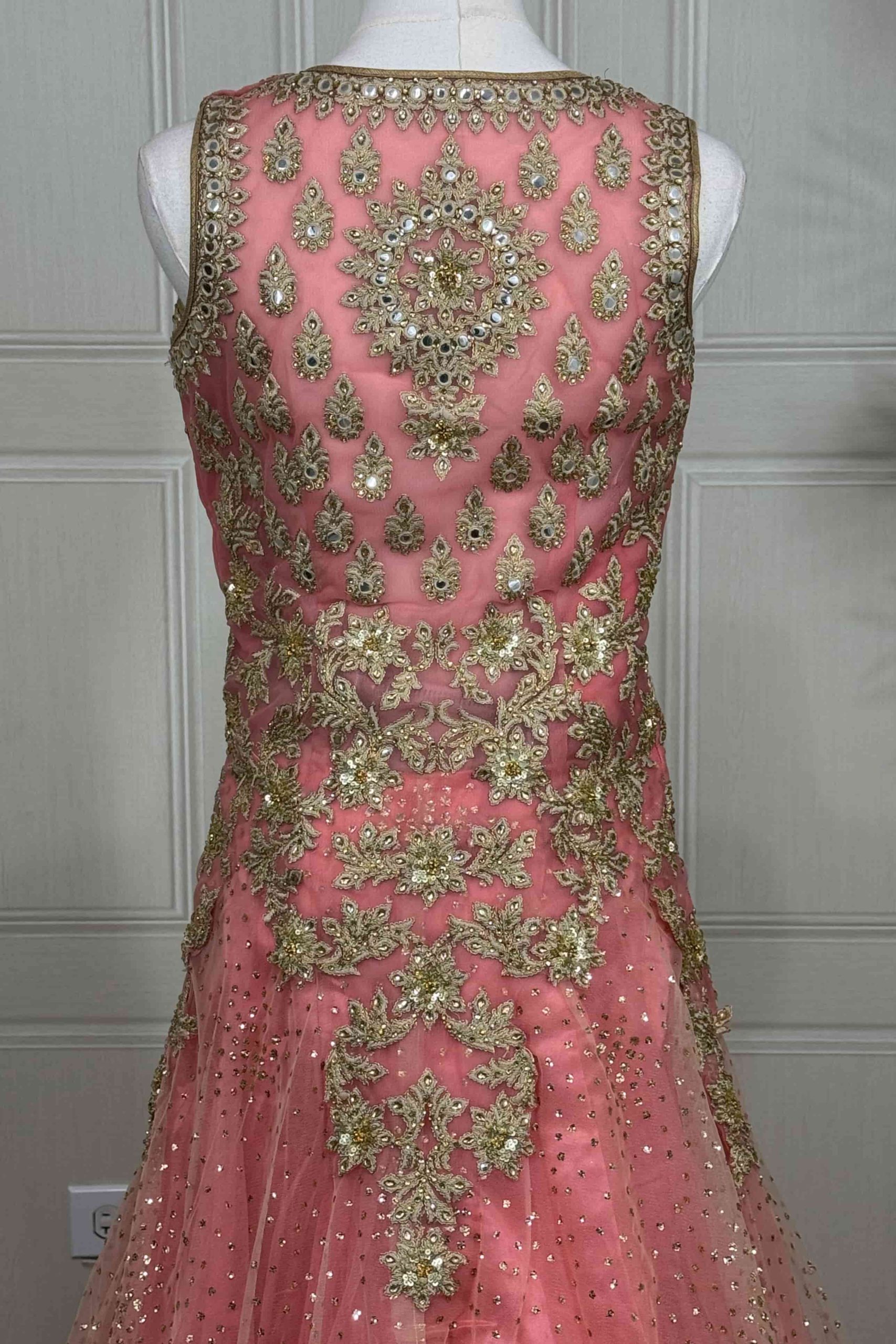 Crafted in soft net fabric, this elegant gown comes in a graceful rose pink shade. It is adorned with intricate embroidery highlighted with stones and mirror work, making it a perfect choice for festive and special occasions.