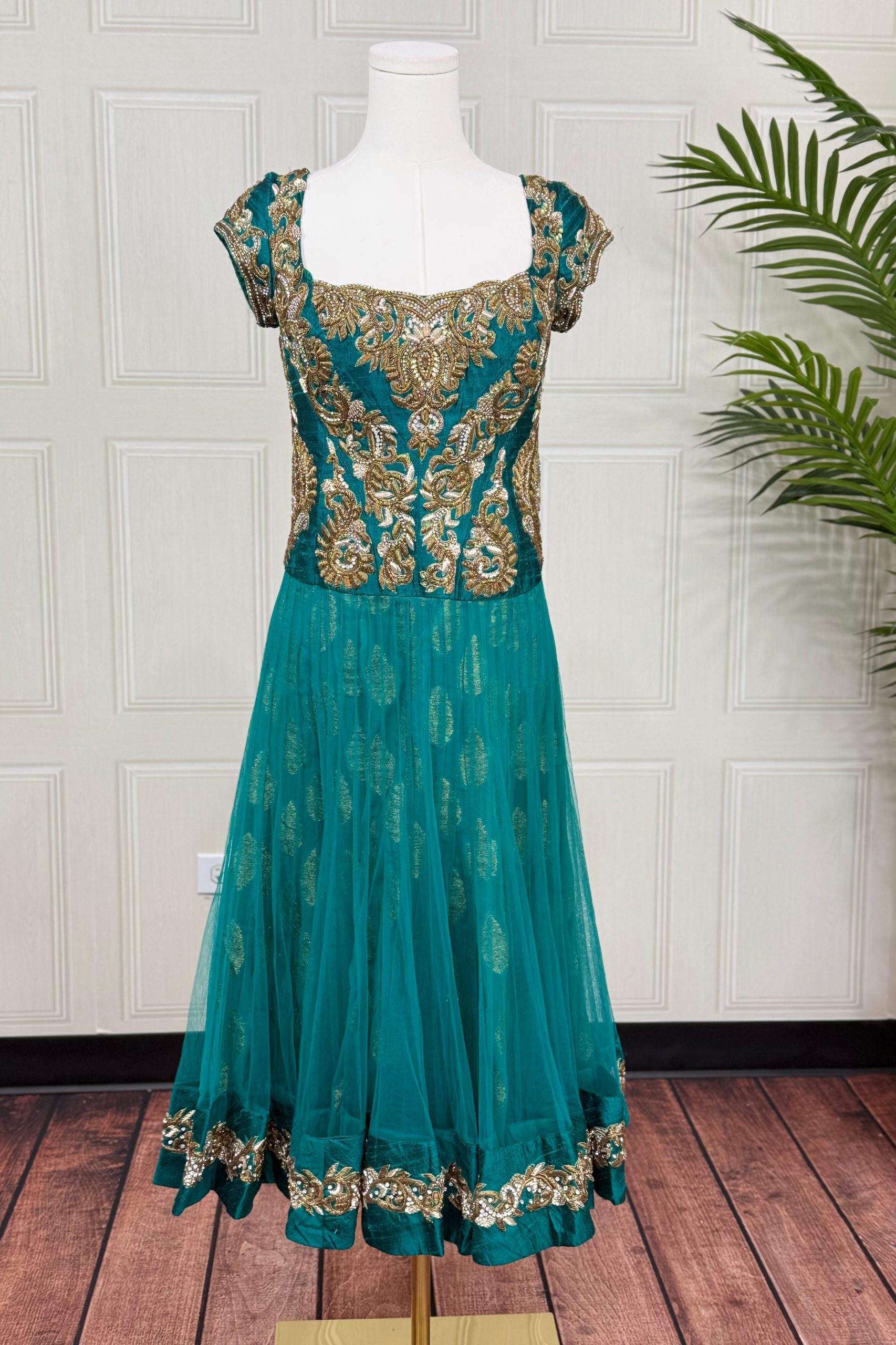 This three piece teal and gold Anarkali set is designed to exude grace, elegance, and festive charm. The Anarkali features a soft net top with a comfortable inner lining that creates a flowing and flattering silhouette. It is adorned with heavy zardozi embroidery, showcasing intricate craftsmanship and adding a rich, regal finish to the ensemble.