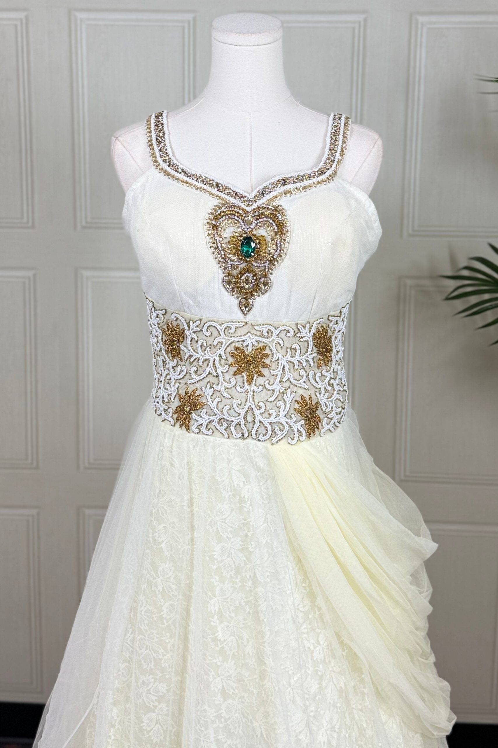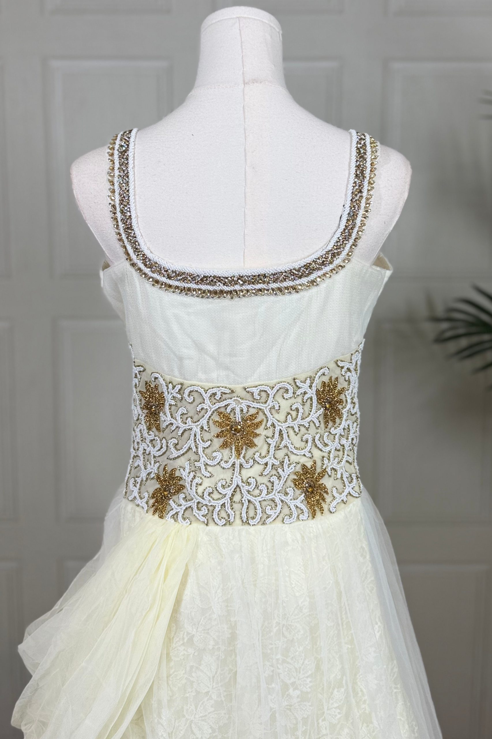 This white gown exudes ethereal elegance with its soft net and mesh layered design. Adorned with delicate pearl and stone work, it captures light beautifully, adding a touch of subtle sparkle and refined luxury. The flowing silhouette creates a dreamy, graceful movement, making it an ideal choice for receptions, cocktail events, or contemporary festive wear.